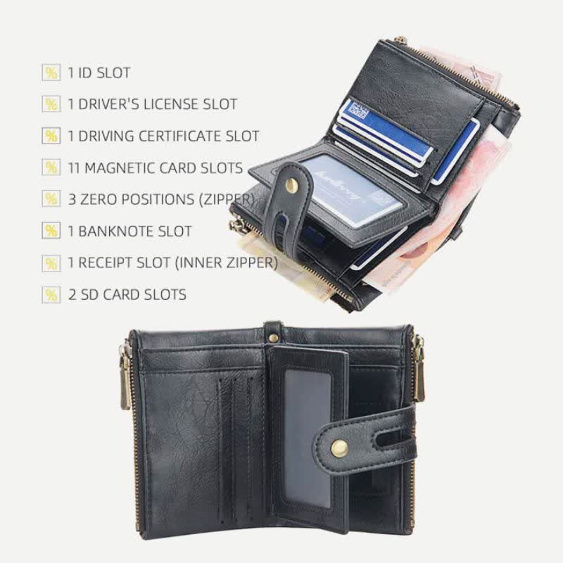 Includes 12 card slots, 2 photo slots, 1 banknote slot, 1 receipt slot, and 2 SD card slots. Plus, the wallet comes with 3 zipper pockets for extra organization and protection of your valuables.