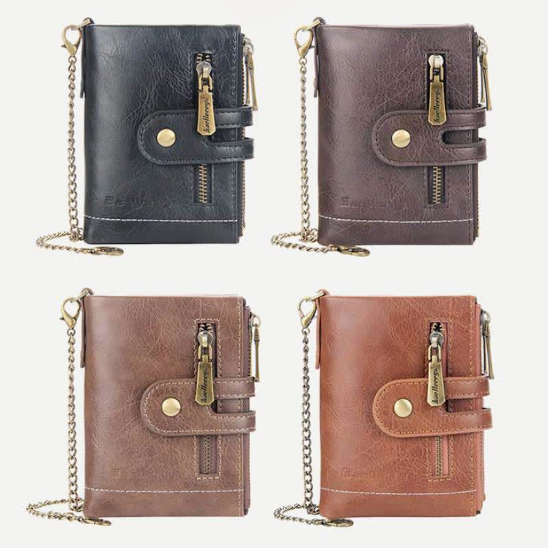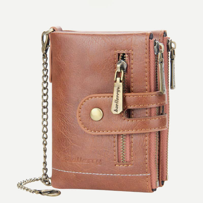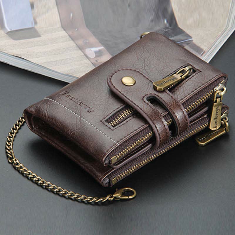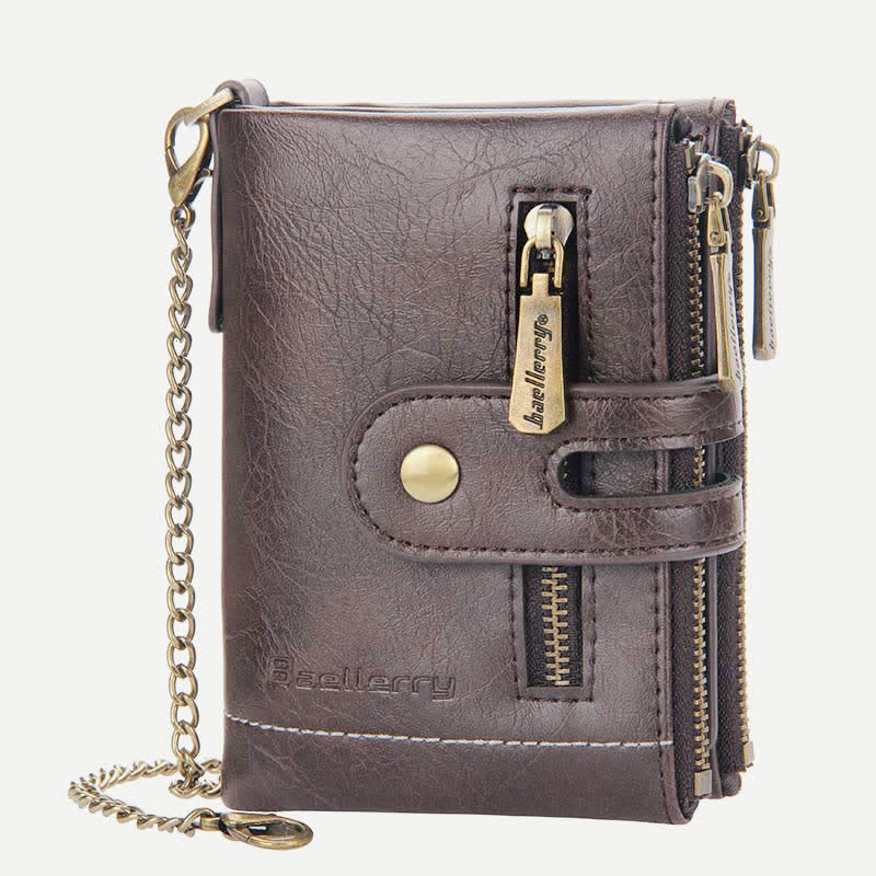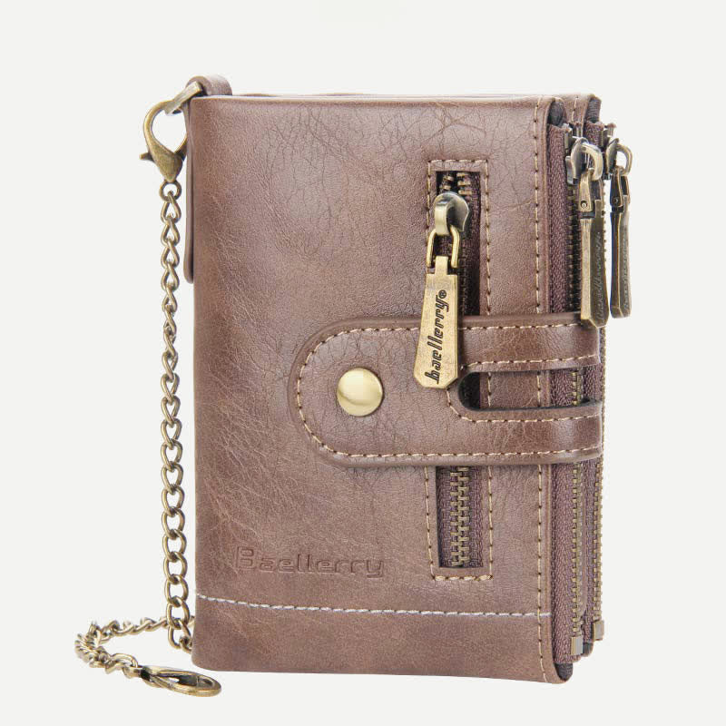 Keep your essentials organized and secure with the Trifold Leather Wallet for Men. Crafted from high-quality PU leather, this wallet features a stylish trifold design with a coin purse, snap zip closure, and an added chain for easy carrying. With ample storage space, this wallet provides an excellent combination of practicality and durability for daily use.