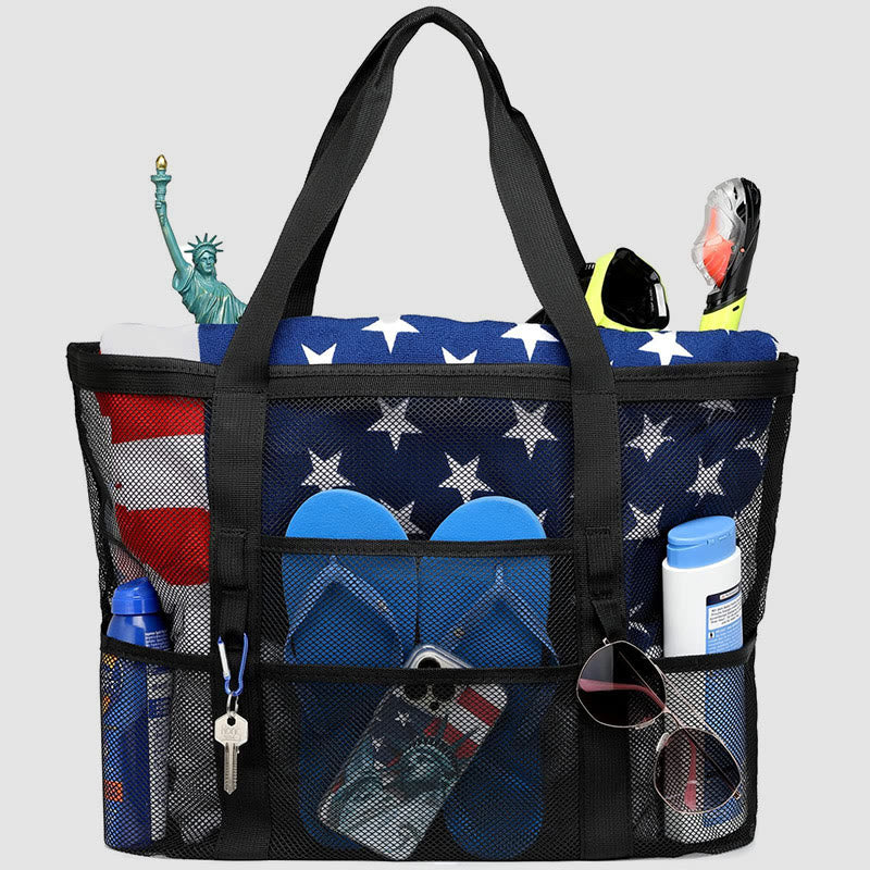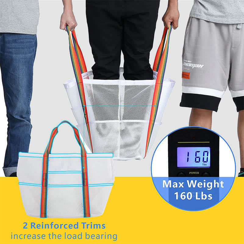 Realizzata in rete di nylon di alta qualità, questa borsa consente all'aria di circolare, rendendola perfetta per le giornate in spiaggia o in viaggio. Il design traspirante aiuta a mantenere i tuoi oggetti asciutti e protetti da sabbia o umidità, offrendo al contempo resistenza e durata.